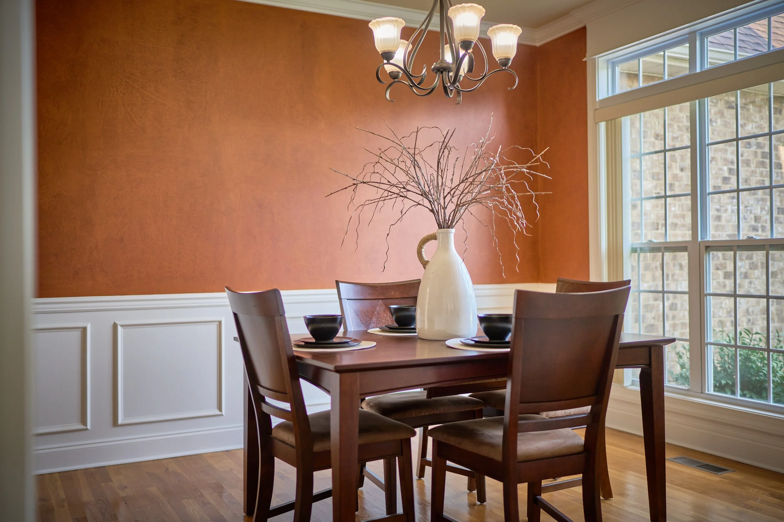 A formal dining room sits next to the kitchen featuring upgraded leather textured walls, wainscoting, and detailed millwork.