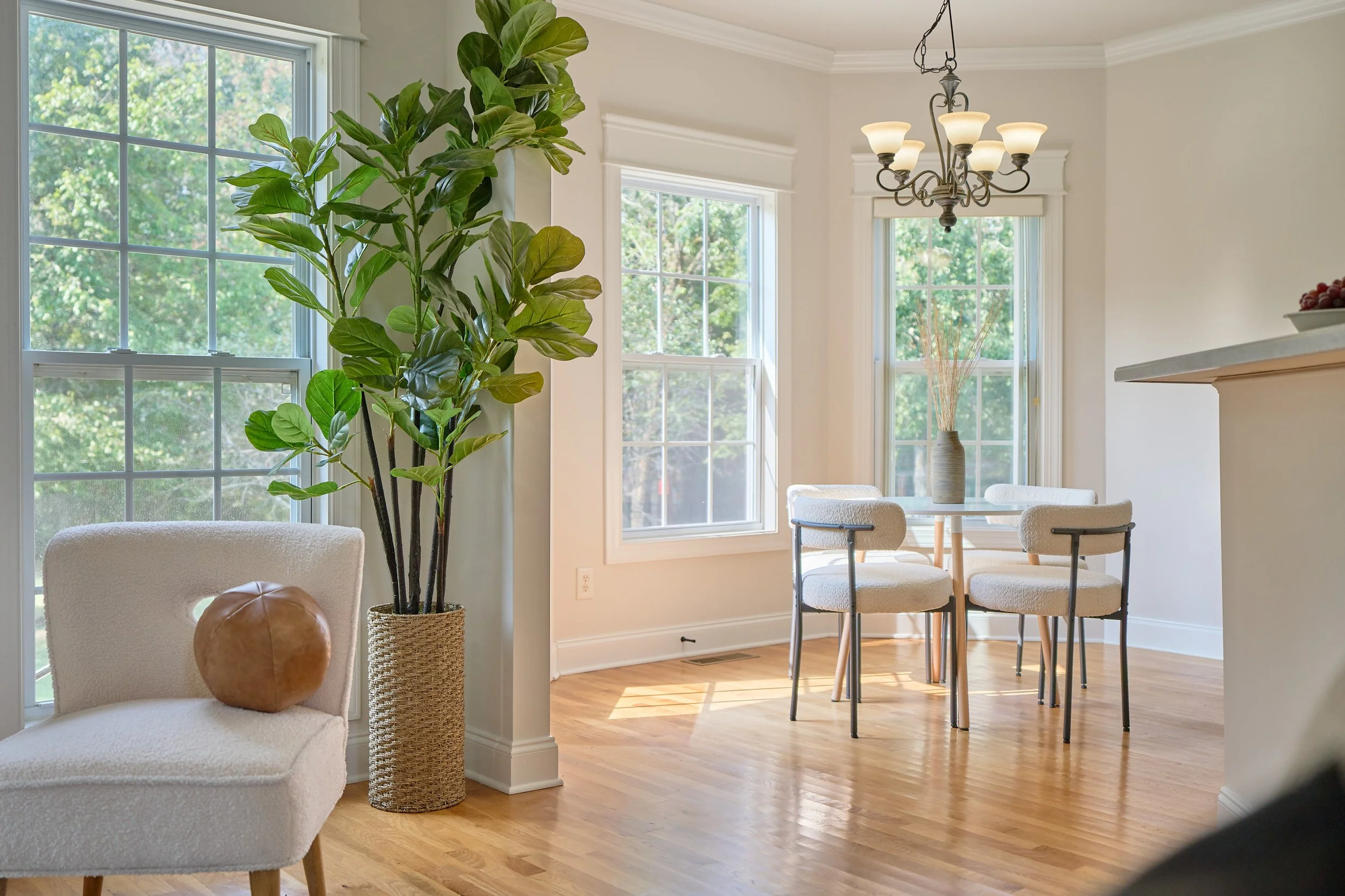 The vaulted ceiling & ample windows bring the daylight inside this bright and spacious living room, which flows into the dining nook and kitchen with raised bar top.